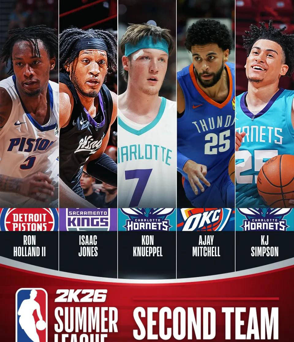 NBA官方近日公布了2025年NBA夏季联赛最佳阵容一阵和二阵名单,夏洛特黄蜂后场新秀KJ-辛普森凭借着在夏季联赛中的出色表现成功入选了夏季联赛最佳阵容二阵。